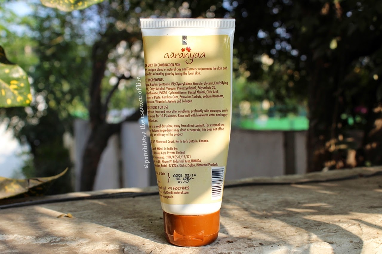 The Aaranya turmeric face pack comes in a squeeze tube that completely opaque and has earthy brown and ochre colours as labels and top. The flip top cap is also tight fitting. The packaging gives all details including ingredients and price. Travel friendly and functional packaging indeed.